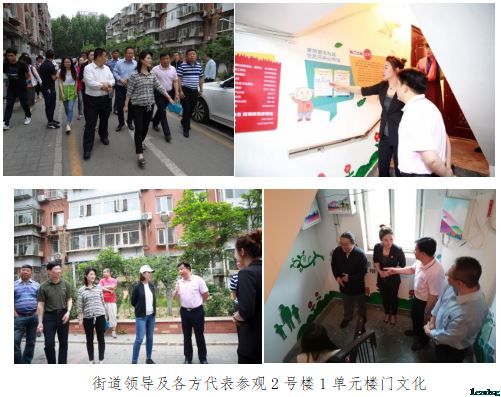 接着各位领导及代表参观了2号楼1单元的楼门文化建设成果。社区党委书记李洋洋对楼门文化打造过程、形成的机制经验进行了介绍;楼门自治小组居民代表崔长恩分享了参与楼门文化建设的感受及成效;胡建东书记表示要继续打造精致楼门,以楼门文化为切入点,挖掘居民自治力量,做好楼院自治建设;王溦主任则表示要继续深入推进楼院自治单元化建设,同时也要调动物业、社区多方力量参与,推进楼门问题解决。
