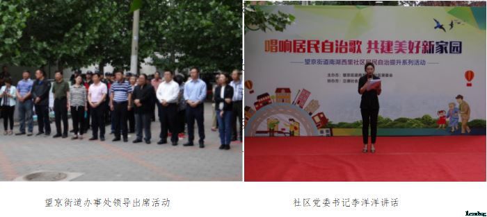 “只要我们手拉手、心连心,我们的家园一定会越来越好!”从南湖西里社区的小广场上传来党员先锋队队长李振洲叔叔的声音,原来这里正在进行唱响居民自治之歌,共建美好新家园活动。望京街道工委书记胡建东、副书记张立云,街道办事处副主任周向上、王溦等出席了此次活动。活动现场,参与人数达200余人,可谓是精彩纷呈,居民自治成果硕果累累……