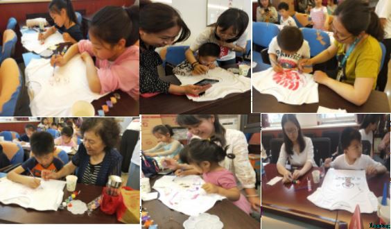 亲子T恤DIY主题活动环节,志愿者给每组家庭发放了白T恤、染料、画笔、调色盘等彩绘用品,大家便迫不及待的开始了,有亲子协同完成的,有独立创作完成的,大家忙的不亦乐乎。“妈妈,妈妈这个社区LOGO我来画”“爸爸这个树干你帮我画一下好吗?我画不好”“老师,我们一家人这么画可以吗?”整个现场甚是热闹。
