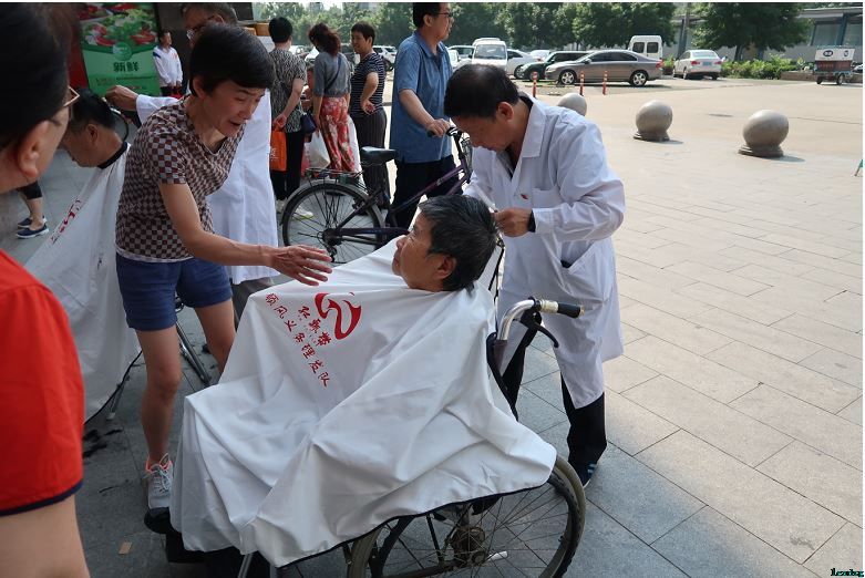 理发师傅是来自三间房地区“红飘带”社区社会组织,他们已经多年为三间房地区的高龄、残障及腿脚不便的老人们义务理发。看着同样已经步入老年的理发师,居民们为理发师点赞、竖起了大拇指。