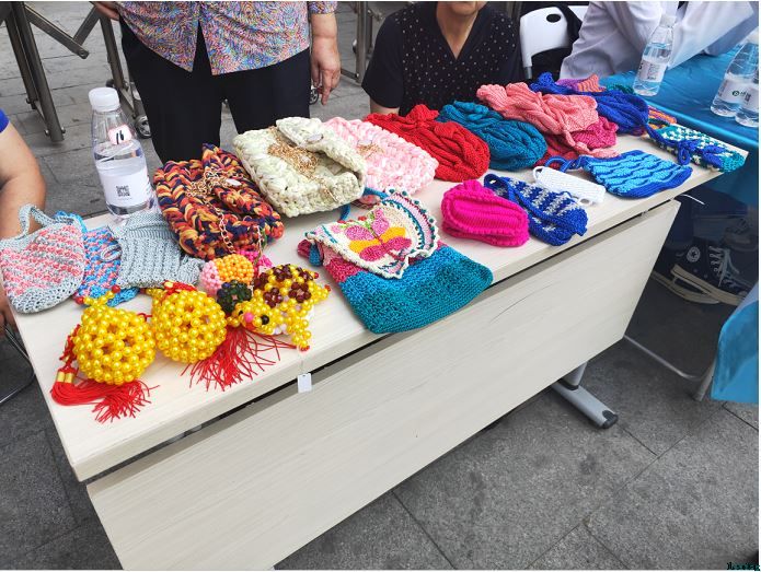 手工品是三间房地区编织队的作品,她们编织的手提包、披肩、钱包、挂件等样式精美,吸引了很多居民。