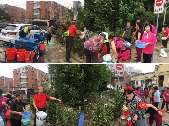 5月17日,一大早在社区小花园一角就传来忙碌的声音,只见环保队伍李振洲叔叔、肖玉珍阿姨正组织大家开展每周一次的定期花园浇水活动。肖阿姨忙着给大家分发工具、跟着运水车去接水;李振洲叔叔组织其余成员拿着水桶和水盆给小花园浇水,大家有说有笑,享受为社区环境贡献力量的快乐。