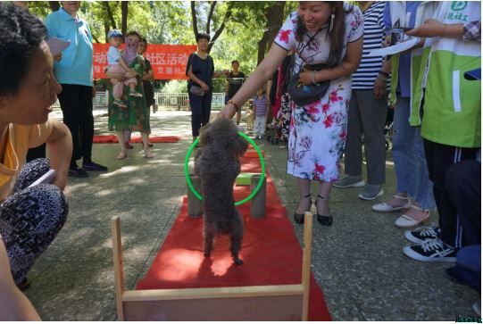 在一阵欢快的音乐声中,活动开始了,主人们领着自家的萌宠边走红地毯,边让狗狗表演才艺,引来了现场阵阵欢呼。萌宠秀后,社区王副书记带领大家宣读了社区文明公约,引导居民树立文明养狗、爱护社区环境意识。运动会设置了“食不可挡”和“节节高跳圈”两个项目,萌宠们在主人的带领下,尽情的展示着风采,那可爱的认真劲逗得围观群众哈哈大笑。