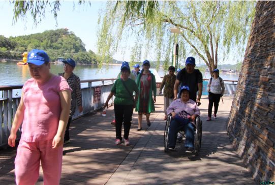 因身体情况未能与我们一起的“家园好大妈”,后来也加入到队伍中。由残疾人小李帮助大妈推轮椅。在无坡道的台阶处,大家相互协作,几个人搀扶着大妈、小李抬着轮椅,一起通过。