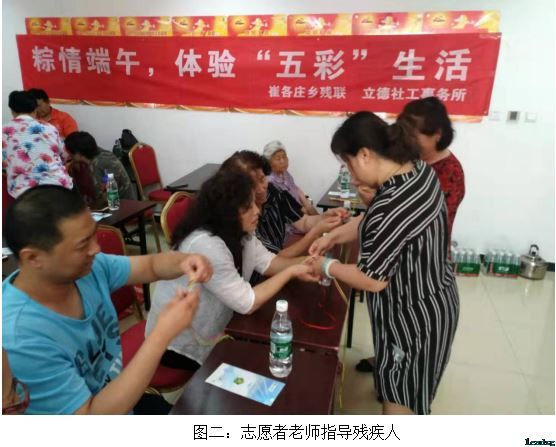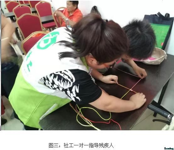 四位志愿者老师分别进入到残疾人队伍中来指导,手把手的教,直到每位服务对象都能够独立完成五彩绳的制作;社工对智力障碍的残疾人进行一对一的指导,帮助他完成一份完整的作品,增强其满足感和荣誉感。服务对象从一开始对五彩绳的不了解,到产生浓厚的兴趣,再到独立完成五彩绳,体验到制作过程的乐趣。一位阿姨说:“真是没想到编五彩绳还挺有意思的,让我学到了挺多,下次有这样的活动我还来参加。”