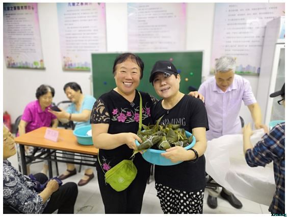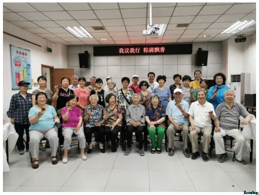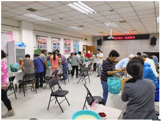 紧张有序的准备环节刚结束,居民们就陆续到达。在简单的问候和交流后,主持人向居民们介绍了端午节吃粽子这一传统习俗的来源和寓意,接下来便是居民自由发挥的时间。只见阿姨和叔叔商量组队,快速的拿粽叶、盛糯米、放红枣、放花生、封口,定型,整个动作如行云流水。阿姨叔叔们把这些食材融合到一个个粽叶里,组成一个个四角的粽子。在现场有包粽子的当然也有看热闹的,时而默默观战、时而出谋划策,材料不够的帮忙从别的桌子上“抢”材料的。随着一声声“我们组包完了”“有需要帮忙的吗”,我们的活动也渐渐进入到了尾声。阿姨叔叔们举着自己的劳动成果,脸上洋溢着开心的笑容。