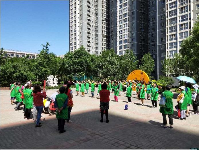 活动当天,社区工作人员和40余位“快乐老妈”志愿者早早来到活动现场,进行准备工作。上午9:30活动正式开始,此时的太阳已经有些刺眼,细心的志愿者们像变魔术一样拿出一顶顶早已做好的凉帽为老人带上。据悉这些凉帽都是“快乐老妈”志愿服务队用旧衣物裁制缝纫而成的,既遮阳又环保。随后,志愿者们为老人表演了精心编排的歌舞节目,熟悉的歌声引得大家齐声哼唱,现场洋溢着欢快祥和的气氛。