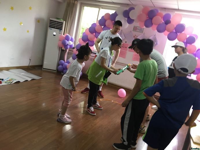 <二>:背对背运气球 每组家长与孩子,背夹一球,侧面移步至终点,双手必须在前方,不能碰到气球,家长与孩子到达终点后,视为通关成功;途中气球破裂或气球掉在地上需要返回起点重新开始。