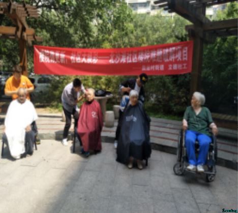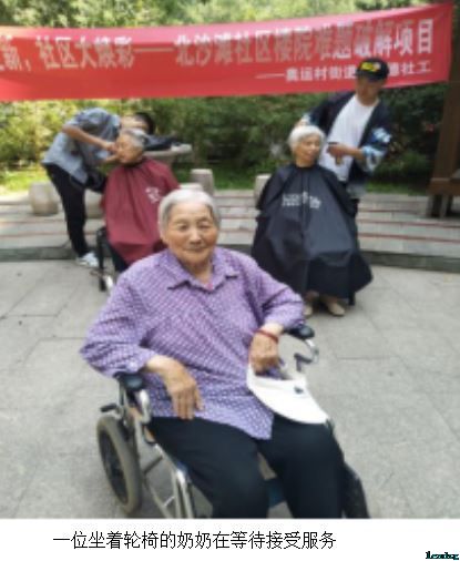 借着社区的石凳石桌,社工请来的理发师傅开始展示他们的技艺,为爷爷奶奶依次换上“时尚“的发型。一位坐着轮椅的奶奶姗姗来迟,就在一边耐心地等待。理完发的爷爷奶奶显得非常精神,脸上洋溢着笑容。