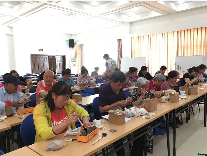 接下来,居民朋友利用分发到的花盆、土壤、多肉、饰品、铲子等工具,一起感受种植过程的魅力。放土、挖坑、种植、培土一系列动作下来,简直就是做全身运动。大家发挥想象力进行植物和饰品的摆放,体验种植的可创造性和多变性。