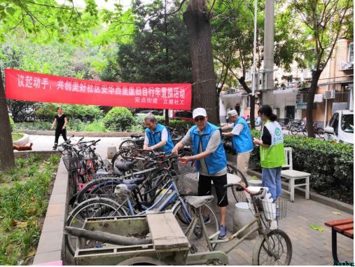 安华西里社区老一区内楼门前、门洞里存放着大量废弃的“僵尸”自行车,既影响楼院的美观又造成了安全隐患。安华西里居委会、社区议事厅与立德社工联合调研,决定于6月20日开始社区美化第一步——置换废旧自行车!