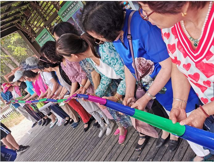 上午9:30全员准时到达汉石桥湿地公园法制长廊进行拓展训练,立德社工将党员和志愿者随机分为三组,并现场推选组长,以小组为单位参与拓展训练。此次拓展设置了“红歌接龙”、“红歌我来猜”和“珠行万里”三个环节,考验大家的团队协作能力。各小组以抽签形式决定红歌接龙的主题,需要现场找到10首带“祖国”“母亲”及“地名”三个主题的红色歌曲。抽到题目后,三个小组快速组织成员进行准备,党员与志愿者分工协作,现场歌声不断。一个“红歌接龙”将大家紧密联系起来,一组在唱的时候,二、三组都跟着唱,还一起帮忙数,特别热烈,吸引了周边很多游客的围观。居民们一边听歌识曲,唱红歌,一边观看法制史长廊。