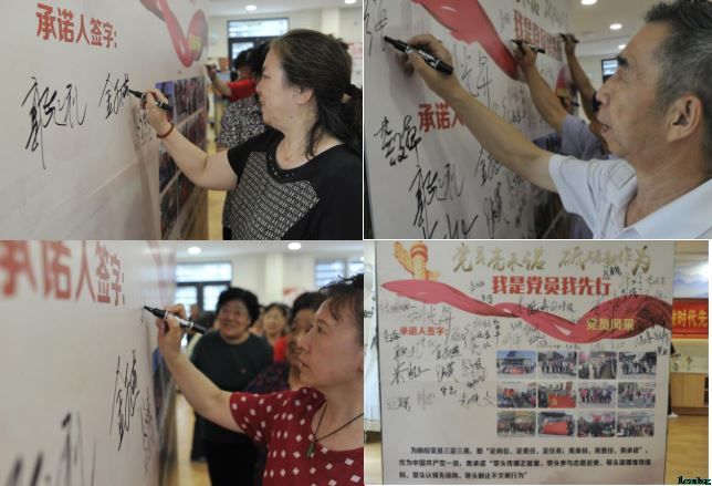 最后全体党员在党员先锋墙上认真地签上了自己的名字,表达了他们对党的坚定信念,立志做好“三定三亮”,即定岗位、定责任、定任务;亮身份、亮责任、亮承诺;同时发挥好先锋模范带头作用,带头传播正能量、带头参与志愿巡查、带头清理堆物堆料、带头认领先锋岗、带头制止不文明行为,与广大党员们一起亮身份,做模范。