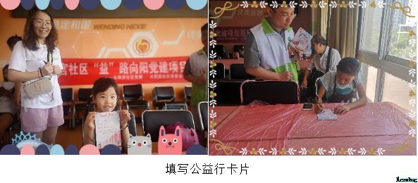 小朋友和家长共同填写“益”路向阳公益行卡片,写下将致力于打造花园式社区,保护社区环境,维护生态平衡,参与志愿行动的公益宣言。社工询问小姑娘想写什么,她认真的说:“保护植物,保护动物,保护我们的地球妈妈!”