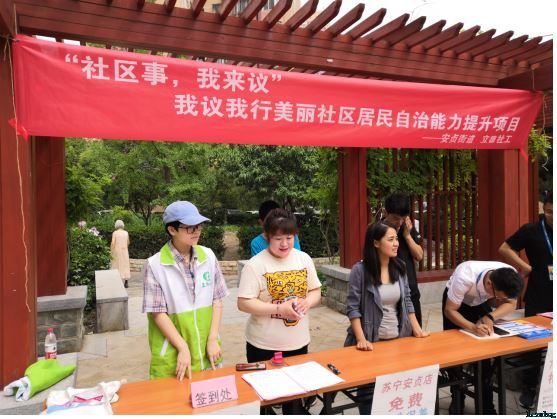 本次活动,由社区、社工联同议事厅成员链接了苏宁易购这一资源,为居民提供免费上门清洗波轮洗衣机或空调服务。对于老年人居多的安华西里社区来说,这样的服务是社区和居民迫切需要的,所以活动伊始便有居民不断自发的把家里清理出来的堆物堆料拿到活动点,由社工、苏宁电器工作人员和回收人员进行登记和预评估,由议事厅成员为居民发放相应的服务清洗卡并盖章,居民持盖章的服务卡到苏宁易购门店便可兑换清洗服务。整个活动过程中,议事厅的成员不断向前来咨询、观望的居民详细解说活动内容,鼓励居民积极参加社区活动。