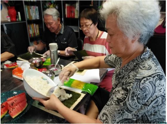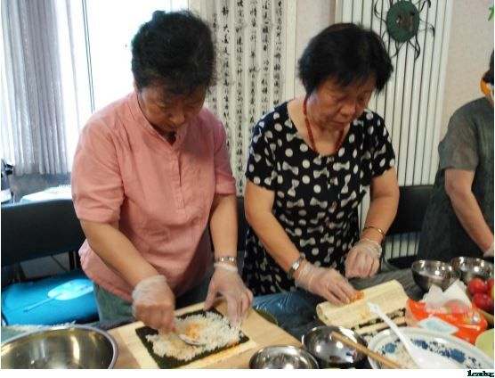 本次活动内容比较丰富,活动开始大家回忆了上节蛋挞的具体操作步骤,并由老人代表武阿姨为大家进行了演练与操作,其他叔叔阿姨们进行了体验。然后骨干成员武阿姨和郑叔叔为大家做全麦面包,最后社工带着老人们一起体验寿司的制作。