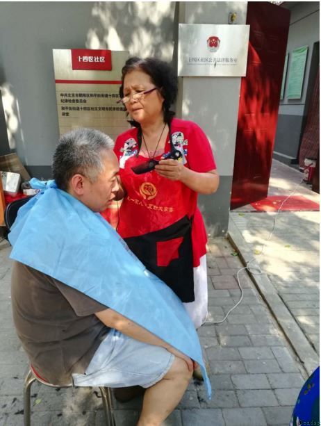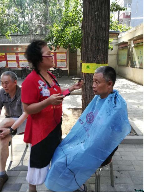 这天,太阳失去了初夏时的温柔,像只火球悬在头顶,空气里都是汗的味道,衣衫粘在皮肤上更令人烦躁,行人步履不停,疯狂想去凉水里扎个猛子。可是,大杨树下有个可掬的背景,冷静的操作着手里的活儿,而旁边井然有序的站着一伙儿人,翘首等待着烫手的推子落在自己的头顶。今天不是助残志愿服务日,社区志愿者“周阿姨”却在正午时分开始了自己的志愿理发服务。