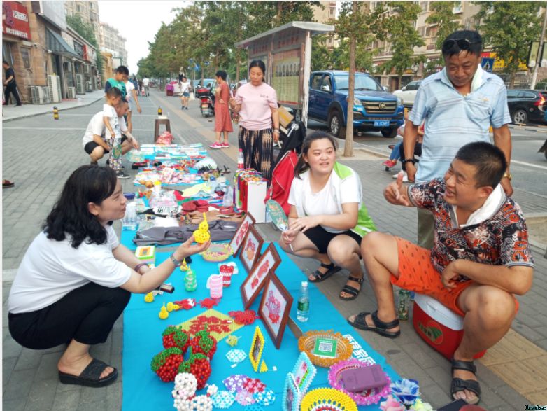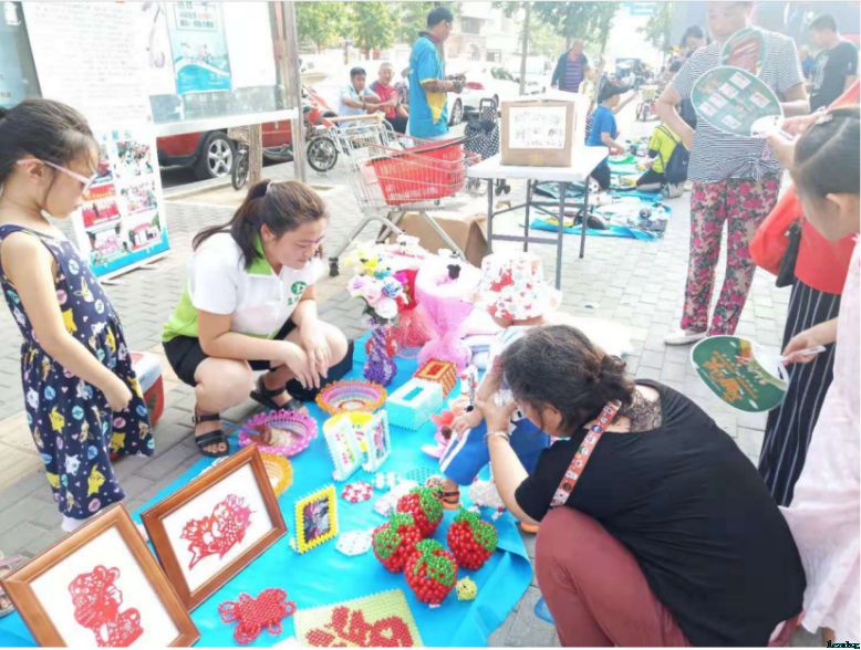 下午5点,义卖活动伴着散发着余热的阳光和晚餐的飘香如火如荼地进行着。由立德社工、园长、志愿者和残疾人服务对象组成的温馨家园义卖队伍精心的把职康产品摆放到众人面前。这些作品都是温馨家园职康小组、书画小组、剪纸小组等在日常活动中制作而成,不仅有传统的串珠作品、丝网花作品、剪纸作品,还有富有新意的丝网花小娃娃,五颜六色的作品吸引了很多居民朋友。
