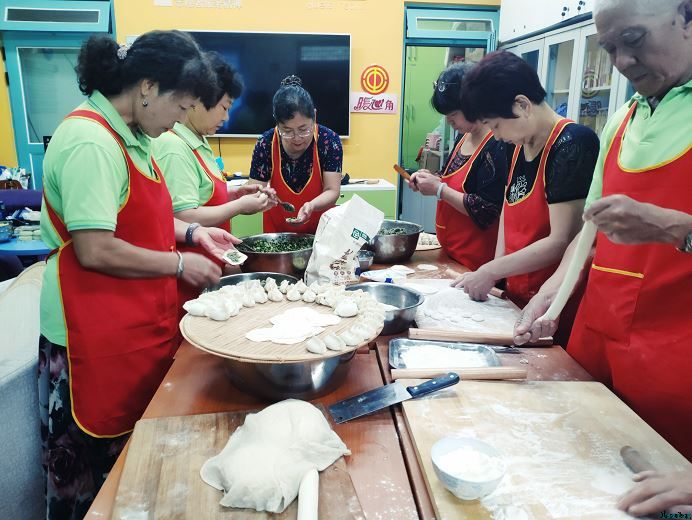 早在活动的前一天晚上,社区的“大厨”们就把活动所需的食材,都洗干净搁置在架子上,保持良好的通风,等待活动开始。早晨七点,参与制作饺子的居民们纷纷来到了活动场地,在明确的分工之后,居民们开始和馅、揉面团、擀面皮、包饺子一系列工作,行云流水的动作,展现了社区居民娴熟的技术和热情洋溢的态度。