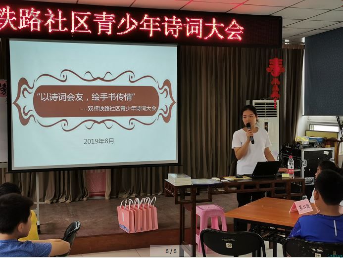 古诗词是我国民族文化的代表,也是世界文化宝库中的一颗璀璨明珠。为了丰富社区青少年的精神文化生活,鼓励社区青少年对中国传统文化的继承和发扬,让青少年重新燃起对古诗词文化的热情,双桥铁路社区党委联合立德社工举办了“以诗词会友,绘手书传情”为主题的诗词大会,吸引了辖区内30余名青少年参加。