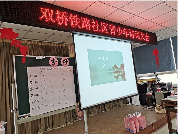 诗词填空和飞花令的环节同样很精彩,经过三轮激烈的角逐和比拼,第三小组和第四小组的总分打平了,于是现场又临时加了一道以“江”为主题的“飞花令”,最终第三小组的孩子们取得了本次诗词大会的第一名,社区领导和老师一起为孩子们颁发了纪念品。