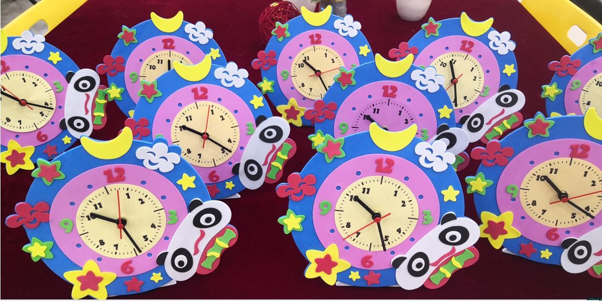 学习了计时制度,大家兴致勃勃的DIY起了钟表。一个个彩色碎片,在老师的指导下,慢慢的复原了原貌,蓝色的底,黄色的表盘,在月亮、星星与白云的映衬下,时针、分针与秒针开始了他们的故事。