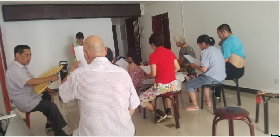 下午2点,虽然现场没有空调,环境闷热,但这并不能阻挠大家来参加活动的热情,所有人都准时来到了活动室。社工把歌词发给大家,随后与大家一起进行面部肌肉放松与发音练习。