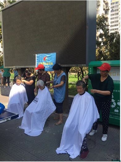2019年8月15日上午9:00,定西南里社区创享计划红锋便民服务队成员已开始在社区居委会门前的小广场忙碌起来。上次刘存巧阿姨带领团队成员为居民更换纱窗,这次为大家进行义务理发。