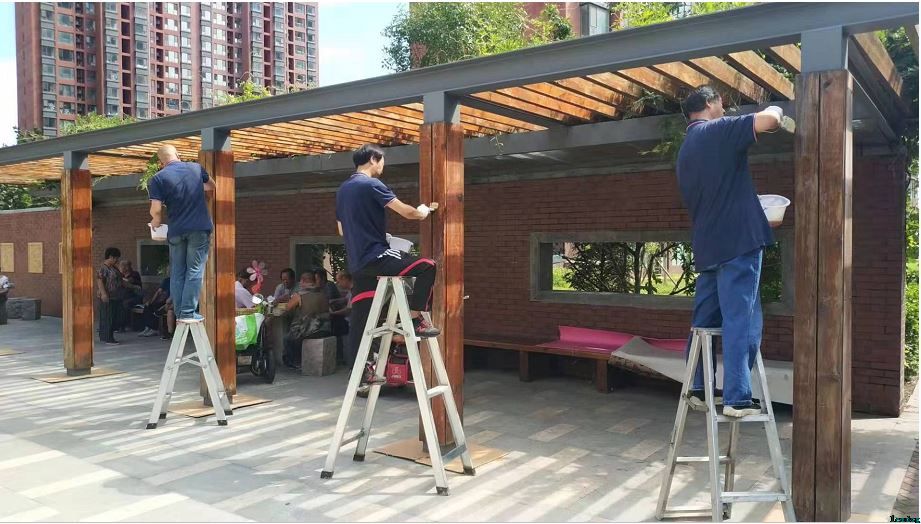 我爱我家“环保花”护卫队进行居民调研与活动宣传时,了解到社区7号楼与8号楼之间的凉亭是很多老人与儿童休闲娱乐的地方。由于使用频繁加之雨水的常年侵蚀,社区的凉亭立柱存在油漆脱落、底部腐蚀生锈等情况。