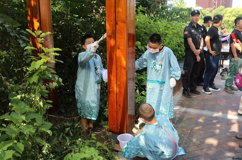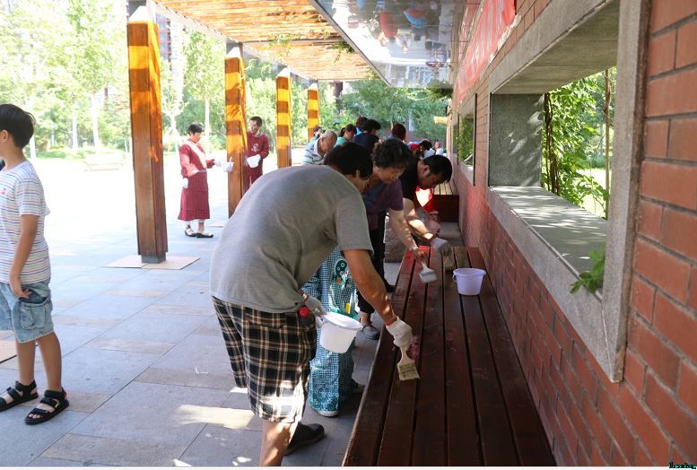 8月15日上午,青少年、人大代表、环保花队员、居民等早早来到活动现场。小朋友负责粉刷低处,居民朋友负责粉刷上面,环保花成员负责进行最后的修缮与补漆。大家齐心协力,干的热火朝天。经过1个多小时的共同劳动,原本斑驳的凉亭焕然一新。