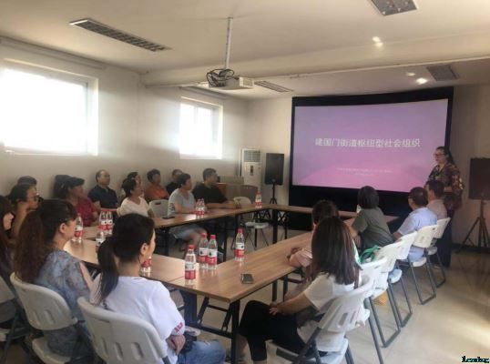 之后,一行人顶着炎热的太阳,步行到了建国门联合会。联合会秘书长杨倩老师为大家介绍建国门联合会的运营机制,以及调动居民参与的方法与实际案例。借助简单的纺织小组,逐步扩展为爱心义卖、爱心捐赠等各类型的公益活动,使社区的兴趣小组转变为公益小组,实现居民服务居民。