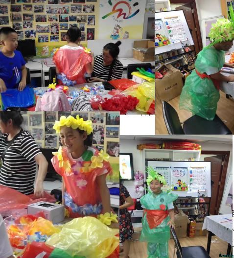 接着,刘老师展示了一些废旧物品再利用的照片,引出此次活动的重点:孩子们在家长的带领下将分发的垃圾袋,根据自己的创意做一件衣服,最后进行评选。