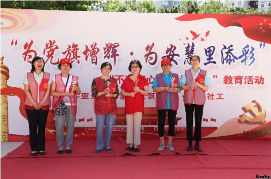 2019年8月30日上午,为加深党民感情,丰富居民精神文化生活;总结上半年党委活动成果,宣传党员的模范带头作用和党支部的战斗堡垒作用,扩大社区党建的覆盖面;表彰针对在服务推进过程中表现突出的党员和居民骨干,激发先锋骨干的荣誉感和责任感,由安慧里社区主办,立德社工承办的“为党旗增辉·为安慧里添彩”“不忘初心,牢记使命”大型宣传教育活动在安慧里葫芦岛广场举行。