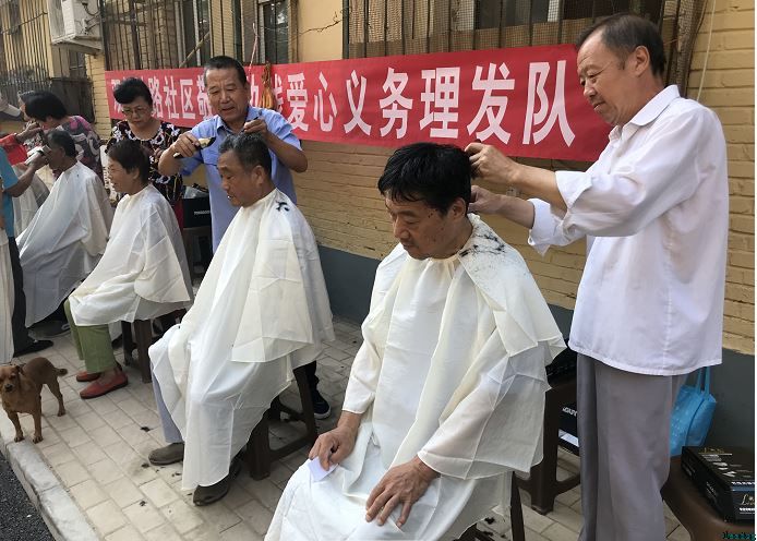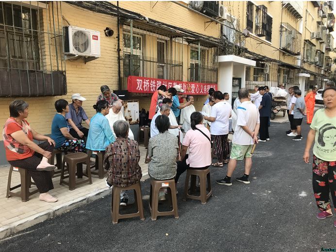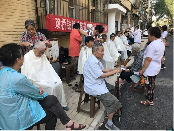 2019年9月2日一大早,在双桥铁路社区服务站门口的空地上聚满了社区的老年人,原来是等着“敬老爱心服务队”的志愿者们给他们理发呢。