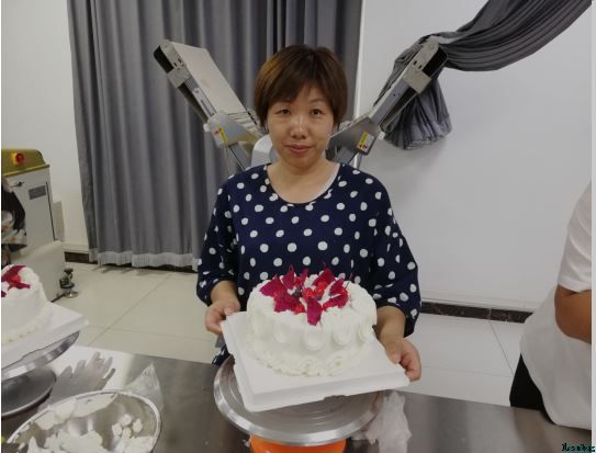 首先,老师让大家先往蛋糕胚子上均匀的抹奶油,并撒上水果,大家一一照做;然后再放另一层蛋糕胚子,均匀的抹奶油;有的人抹的不是很均匀,老师就过来帮忙修饰。裱花时,老师先给大家做示范,然后由残疾人动手操作,再摆放水果。近一个小时的时间里,一个个充满想象力与创造力的蛋糕呈现在大家面前。其中有位残疾人手捧着蛋糕说:“一想到是为祖国70周年庆生,不禁做的更加的认真了”。