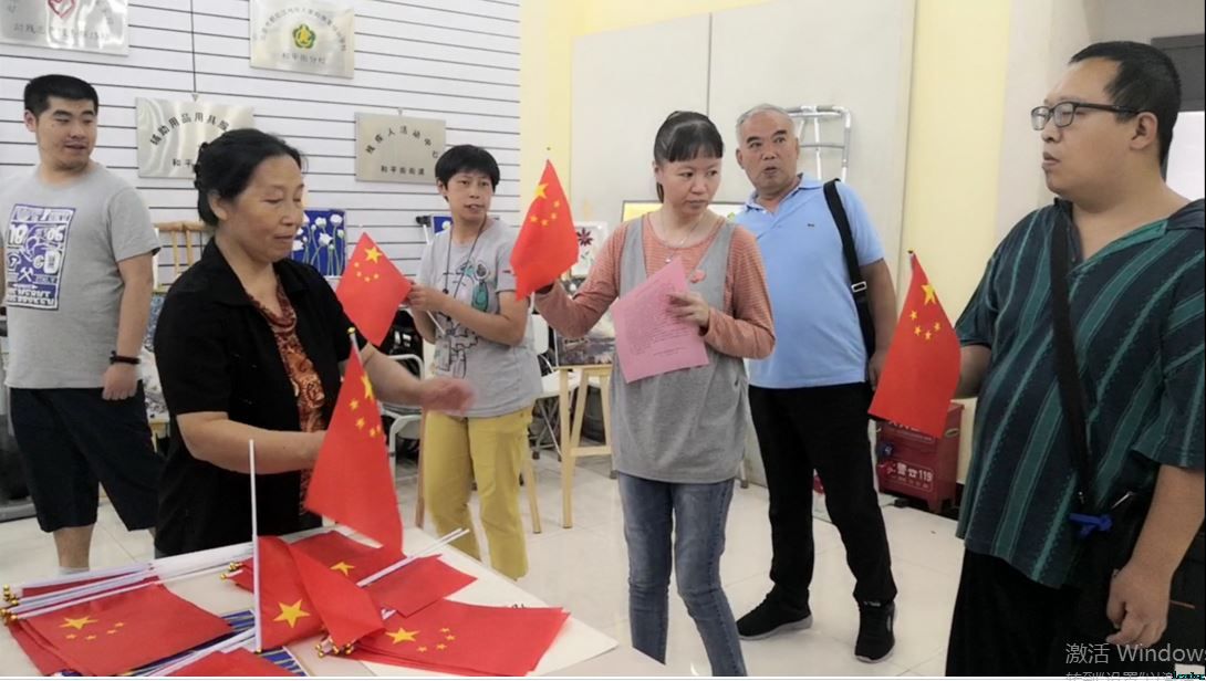 接国旗,歌唱祖国。今天的进门仪式跟往常不一样,一面面鲜红的五星红旗,在《我和我的祖国》旋律下相继绽放,流露出残疾朋友对祖国的真情。