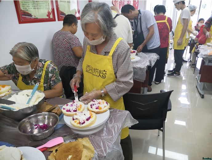 9月11日的三山新新家园无疑是非常热闹的一天。众多的残疾朋友齐聚一堂,共同制作水果奶油蛋糕。看到桌子上摆满了水果、奶油以及各种工具,大家纷纷动起手来,都想体验一下这蛋糕师傅的感觉。但是这第一步该怎么下手呢?别着急,咱们一步一步跟着老师来进行操作。在老师示范好以后,就轮到了大家大展身手的时间,每一桌都忙得不可开交,大家边聊天,边放水果、抹奶油,水果放多了奶油抹不匀了,咱们就找老师帮忙。慢慢的,大家手中的蛋糕都做好了,各有特色,再加上准备好的蛋糕盒子,真是漂亮。