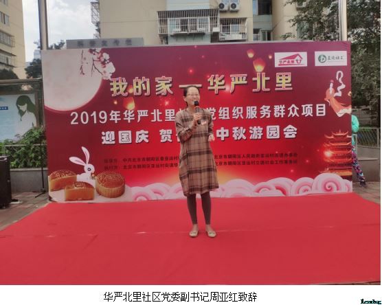 本次活动以中秋游园会的形式进行,共分为两部分:舞台区部分和游园会部分。在舞台区,社区党委副书记周亚红首先致辞并向居民送祝福。她说:“今天是个好日子,不仅天气特别给力,又正值中秋佳节,衷心祝愿华严北里社区居民度过一个美好的中秋佳节!”