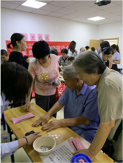上午八点半,住在附近的热心居民就陆陆续续进来询问:“你们这今天是不是有活动啊?”负责签到的立德社工微笑着回答:“是的,阿姨,咱们这九点半有运动会呢,您可以来参加我们的活动,有夹硬币,点钞等等游戏环节,只要参与三项游戏咱都能有小礼品哦”。
