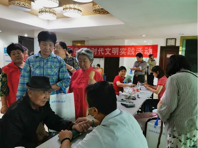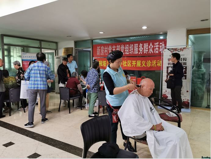 随着活动的开始,老人们络绎不绝地来到现场,各个科室医生为老人们提供测血压血糖、中医护理、眼科、口腔、健康宣教等诊疗服务,并耐心细致地为老人们诊断、分析、讲解,为老年人送上一份健康。同时,还有来自北京双桥木北造型店的11名理发师为高龄老人义务理发,给老人们带来了方便。