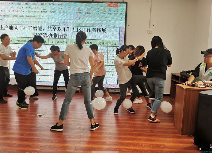 第四轮是“气球爆爆爆”,通过限制时间2组PK的方式,促进社工之间的竞争意识和互助意识。