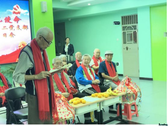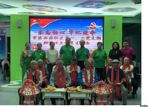 接下来全体成员共同合唱《祝你生日快乐》,社区党委书记、社区主任以及各支部委员为老党员们系上围巾,合影留念。