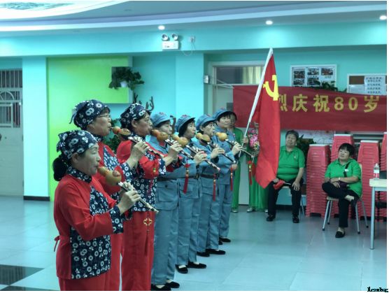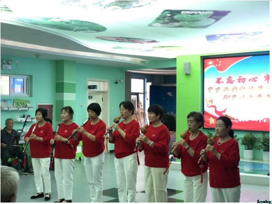 一张张笑脸、一个个音符,手指与葫芦丝的结合,青春葫芦丝队一曲《歌唱祖国》唱出了中国七十年的发展壮大,唱出了对祖国母亲深切的感恩与爱,唱出了党员坚定跟党走的决心。随后,曲风一转,欢快轻松的节奏转身响起,队员们走近老党员们,一首《祝你生日快乐》引得老党员们温暖动容。