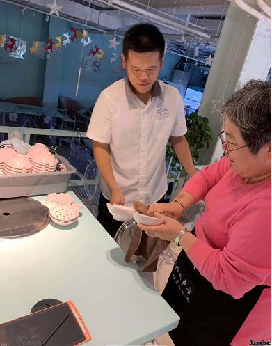 我们与餐厅负责人说明来由后,负责人表示非常欢迎,并给学员们分配工作任务。其中两个人在后厨负责穿串,一个人在前厅整理餐具,工作都非常认真,还受到了餐厅工作人员的表扬。由于餐厅服务人员是聋哑人,所以学员通过写字板向他们请教问题,比如,餐具如何摆放,接下来需要做什么等等。整个活动期间,学员和其他人相处的非常友好。