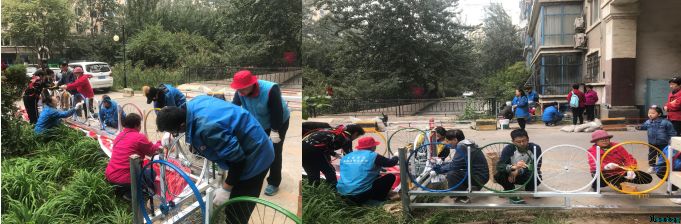 2019年10月19号上午九点整,天通西苑第二社区的党支部书记、居委会主任联合北京立德社工、社区社会工作者、居民以及志愿者,在社区消防通道处开展了废旧自行车拆装并美化成彩色花圃围栏的活动。现场,拆装师傅用切割机把废旧自行车的前后轮子给切割下来,然后焊接在组建好的栅栏上面;焊接完一组围栏,居民们就纷纷戴起手套、拿起刷子开始给自行车轮子涂上五颜六色的油漆,党支部书记、居委会主任也加入了居民彩绘的行列,活动现场气氛热烈。