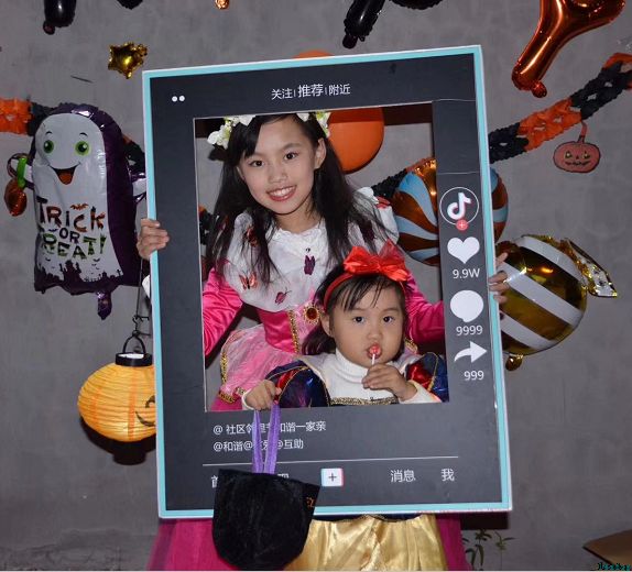 此次在室外活动区域设置了“万圣”“邻里”“欢乐”等多个主题元素拍摄点,由社区摄影队成员专门为各组家庭服务拍照。