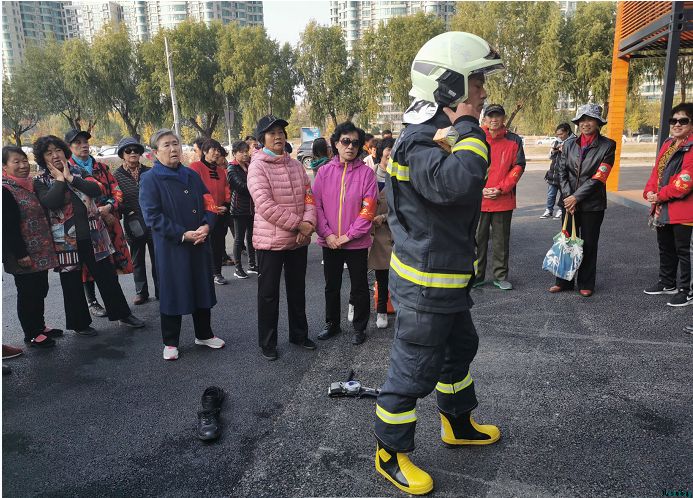 之后,消防员依次为居民展示了消防担架、消防水袋、消防服、消防车等装备,居民门争先恐后地询问“消防战斗服重不重啊?”、“衣服上的多功能锤是做啥用的?”……消防员还邀请居民带上氧气罩,背上氧气瓶,从着装上体验一回“消防员”。消防装备重达20斤,居民穿上后,感慨说“看着小伙子穿的挺轻松,没想到这一上身挺重的。”