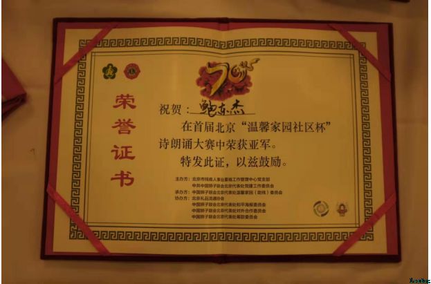 不负众望,鲍东杰从众多选手中脱颖而出,荣获北京市“温馨家园社区杯”《诗朗诵大赛亚军》、《最佳原创一等奖》、《最佳风采奖》。小红门示范温馨家园也因此荣获《最佳温馨家园奖》,这是对我们的肯定和鼓励!
