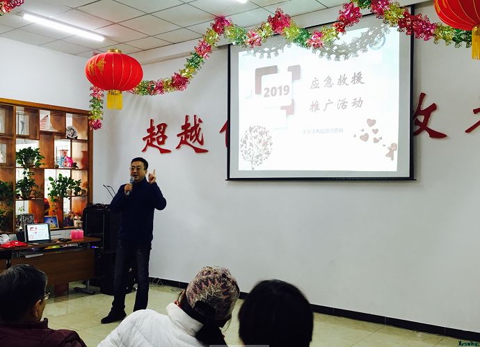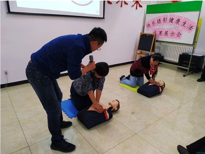 面对“心脏骤停”、“突发猝死”等现象,老师给大家讲:一、检查周围环境;二、检查“三无”(意识、呼吸、脉搏)状况,决定施救措施;三、根据情况,进行施救。检查的手法、“心肺复苏”的按压和人工呼吸手法,老师边讲边操作,现场示范。
