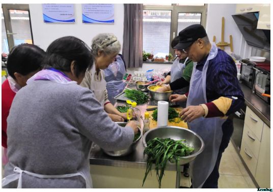 在老师讲完烀饼制作的步骤之后,老人们便系上围裙动起手来,有切菜的、有炒蛋的、有拌馅的,分工明确。经过前两次的活动,老人们已经9培养除了默契,也渐渐融入了贞爱之家这个小家庭,没有了最初的缄默和生疏。